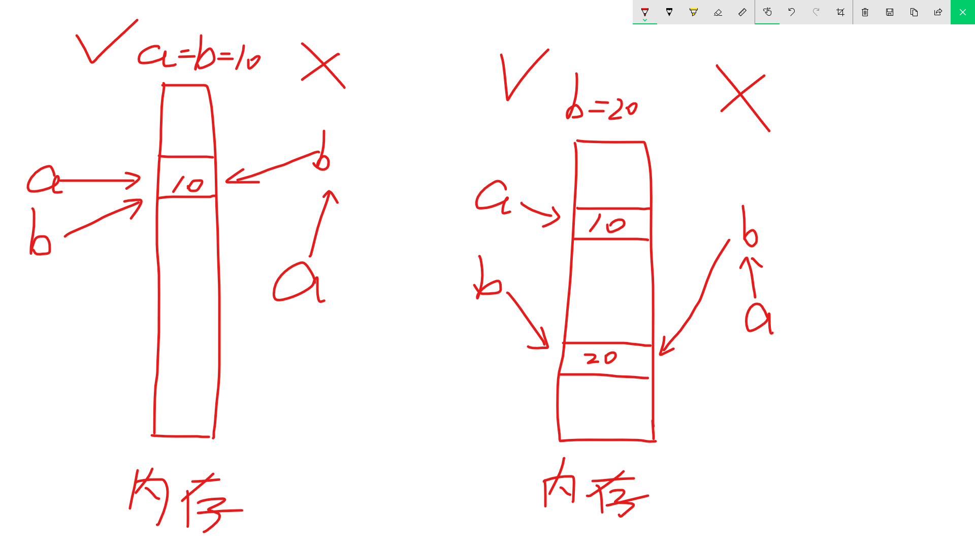 从上面的三段代码可以看出,变量指向的永远是值,而不会指向变量,a=b=10的真实含义是a指向10,b指向10,这里的两个10是同一个10,后来b=20意思是b变心了,b现在指向了另外一个值20,但是a指向的依旧是10,这里一定要注意,a指向的是10,而不是指向变量b,理解不了那就上图: