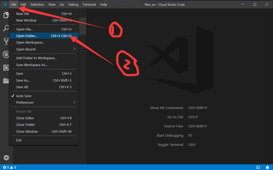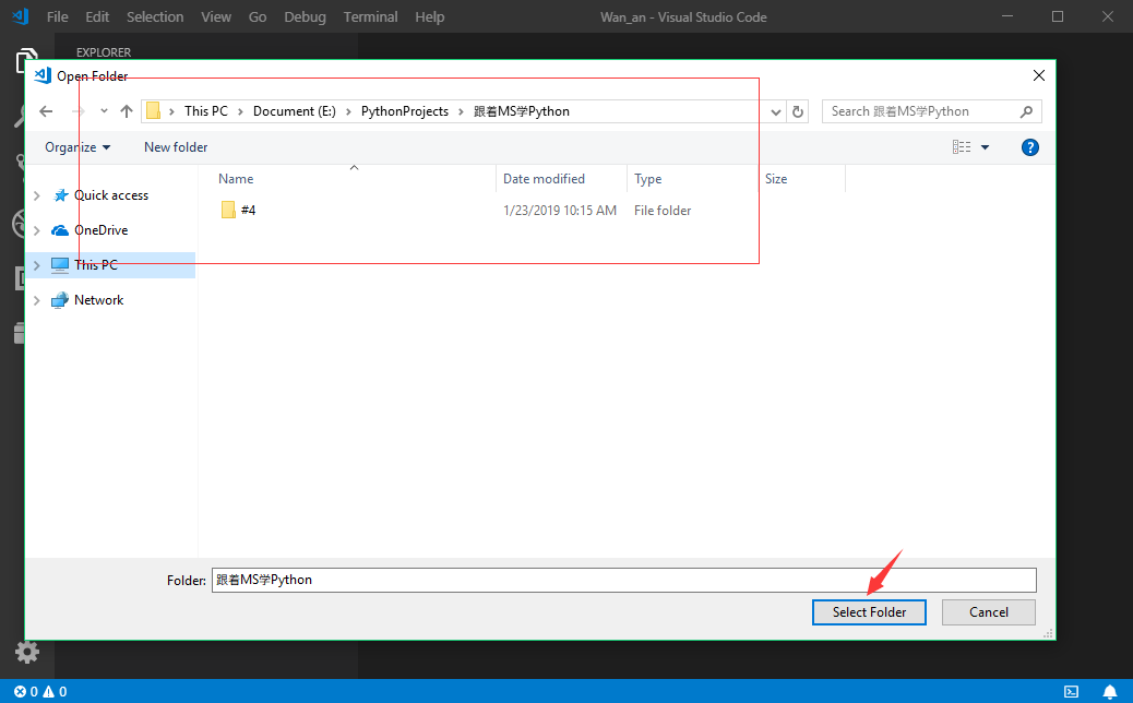 打开VSCode,点击文件-->点击打开文件夹,选择E盘的PythonProjects下的跟着MS学Python,如下所示: