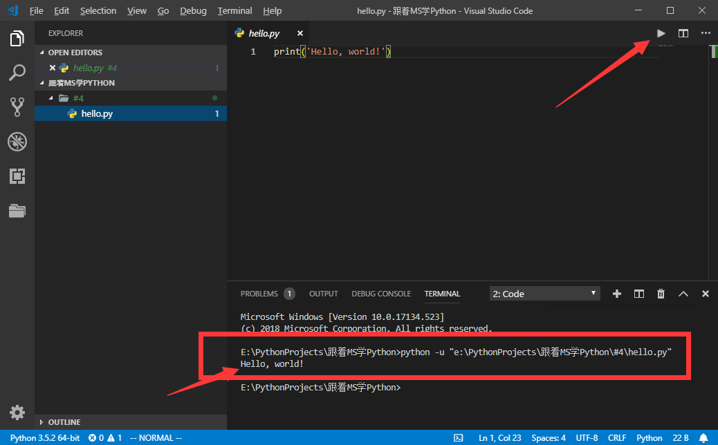 python e:/PythonProjects/跟着MS学Python/#4/hello.py