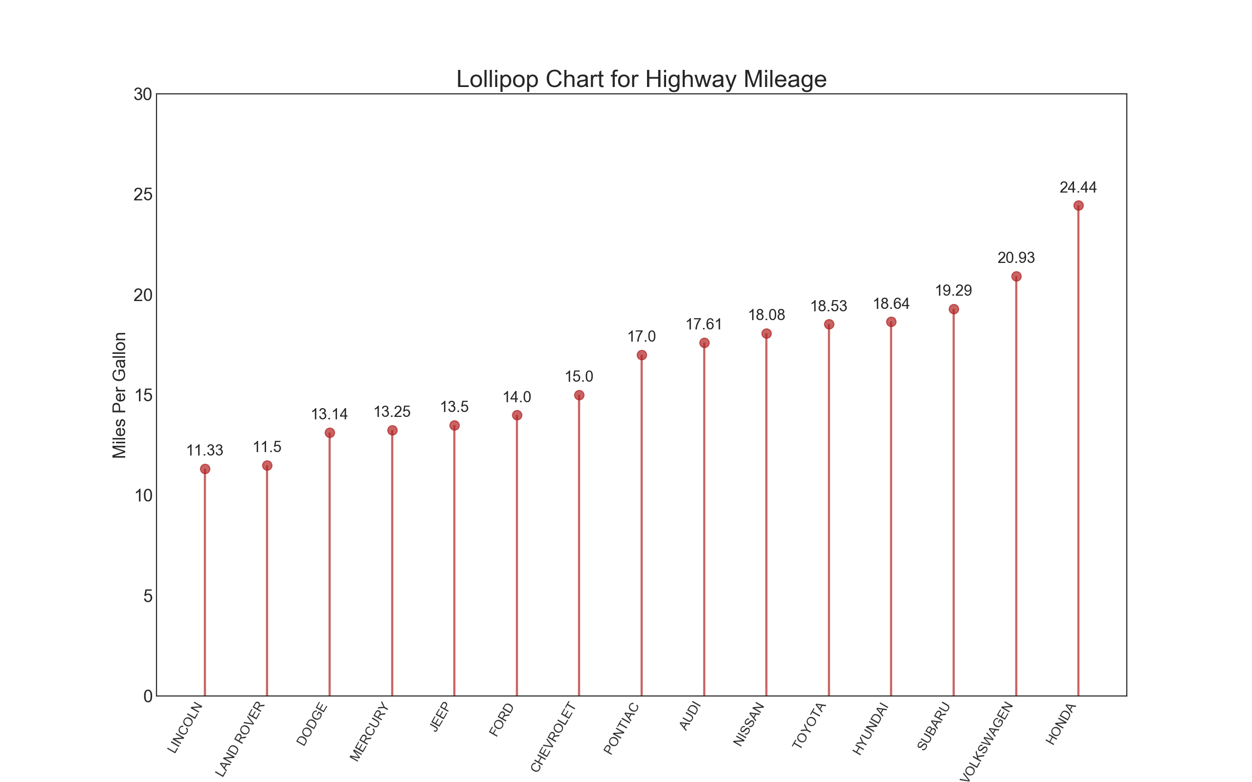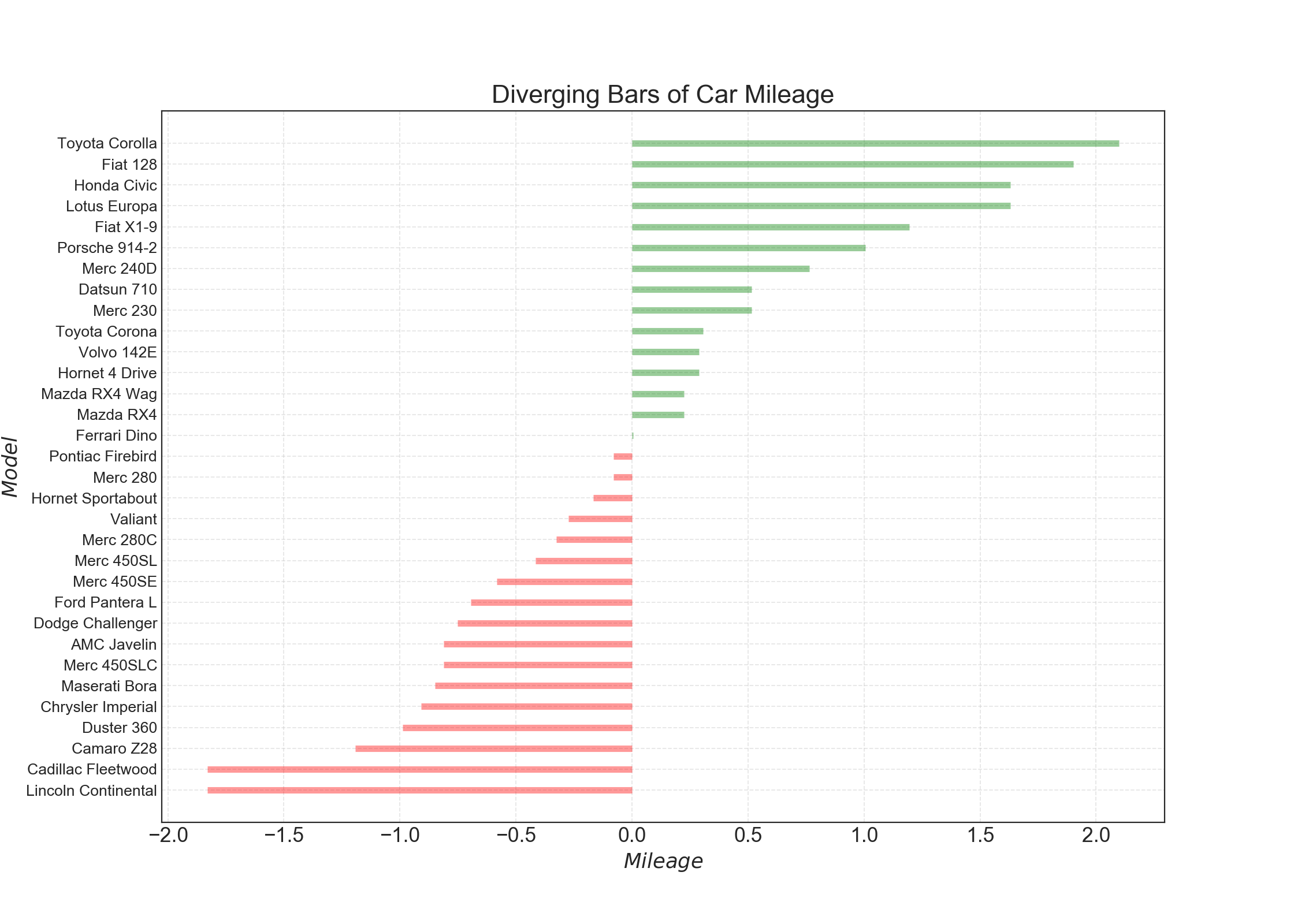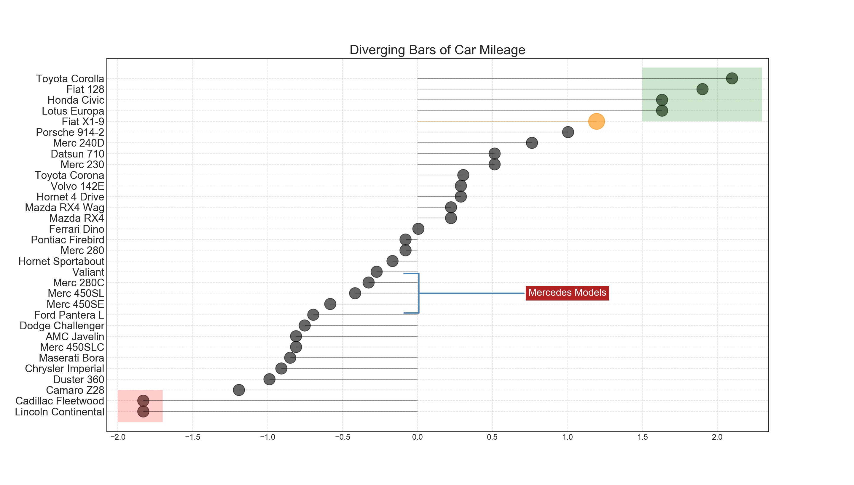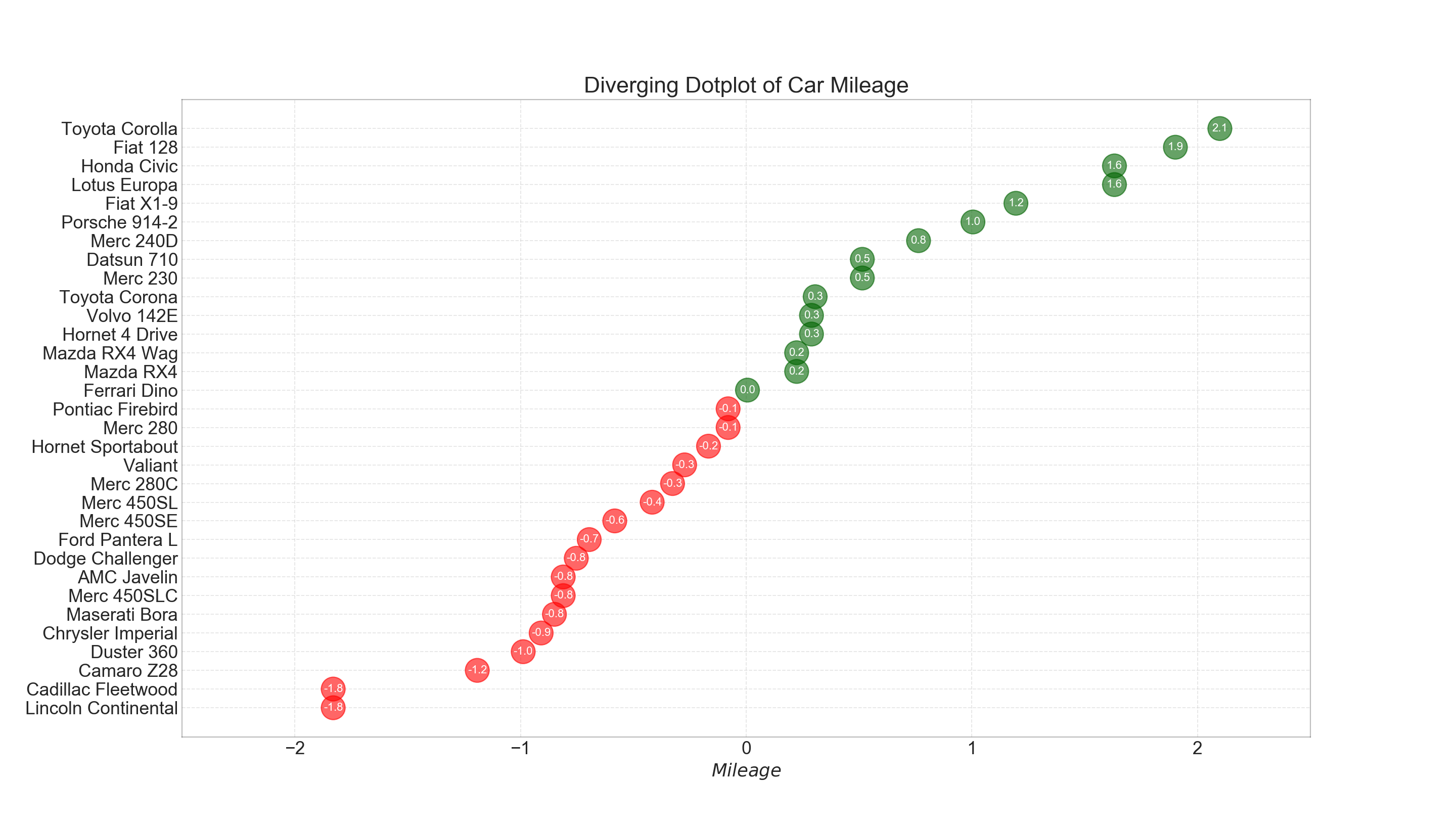 发散点图也类似于发散条。然而,与发散条相比,条的不存在减少了组之间的对比度和差异。