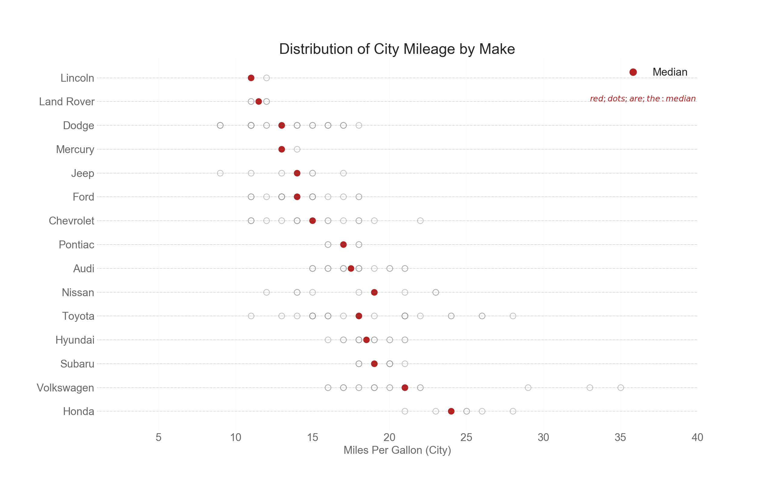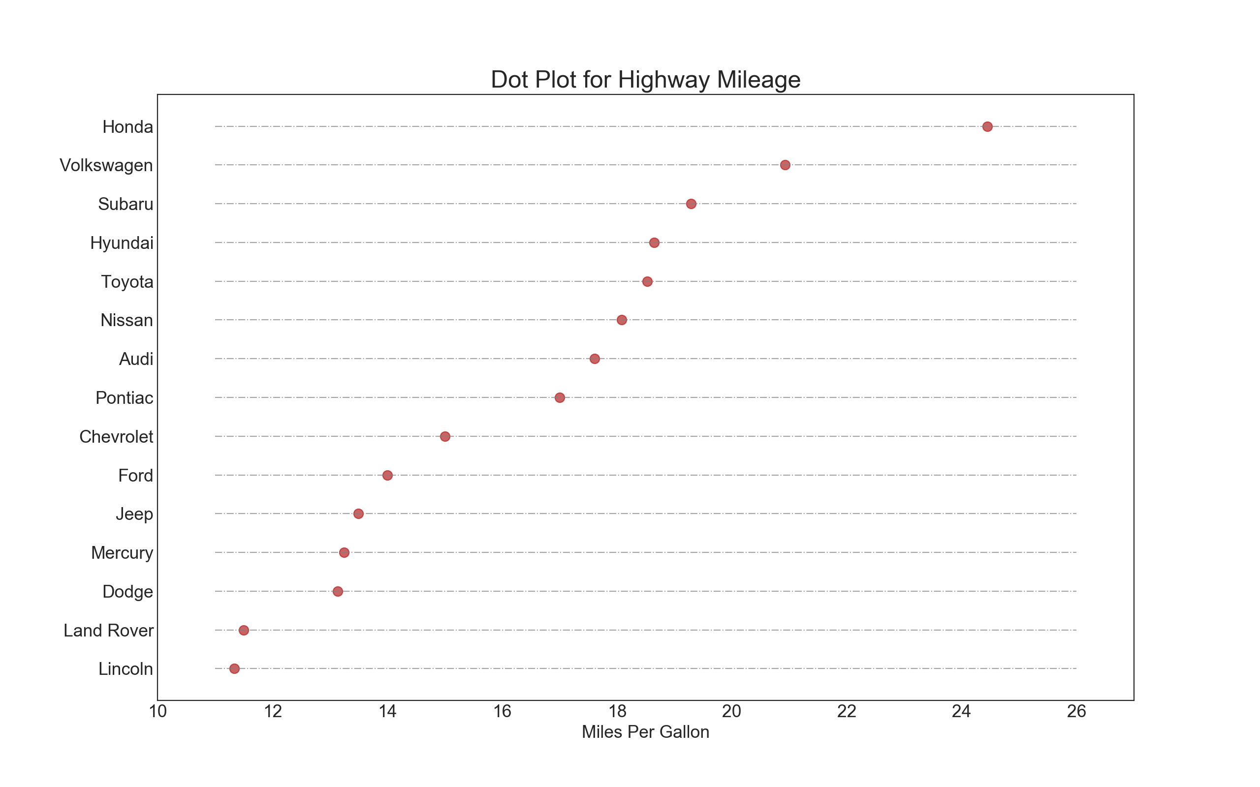 点图表传达了项目的排名顺序。由于它沿水平轴对齐,因此您可以更容易地看到点彼此之间的距离。