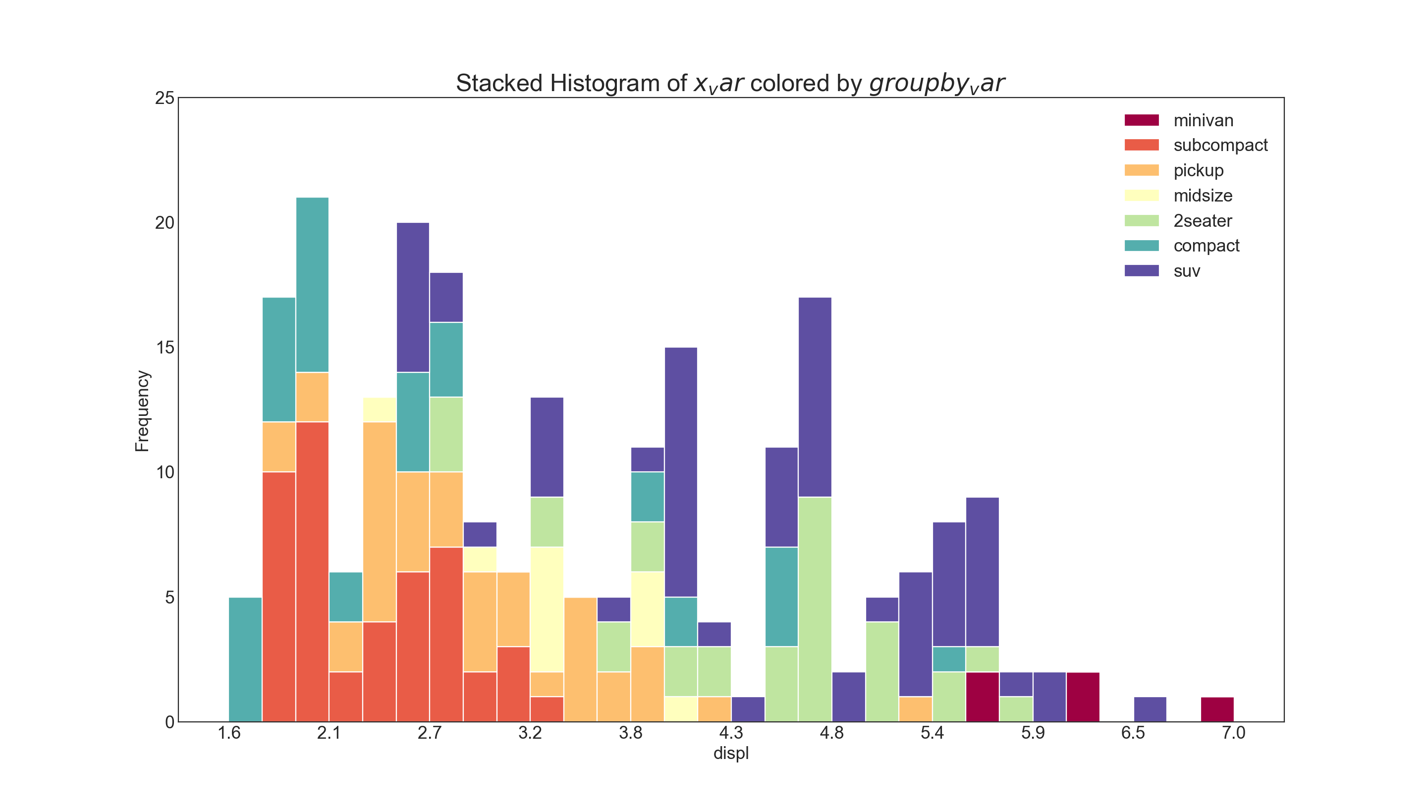 直方图显示给定变量的频率分布。下面的表示基于分类变量对频率条进行分组,从而更好地了解连续变量和串联变量。