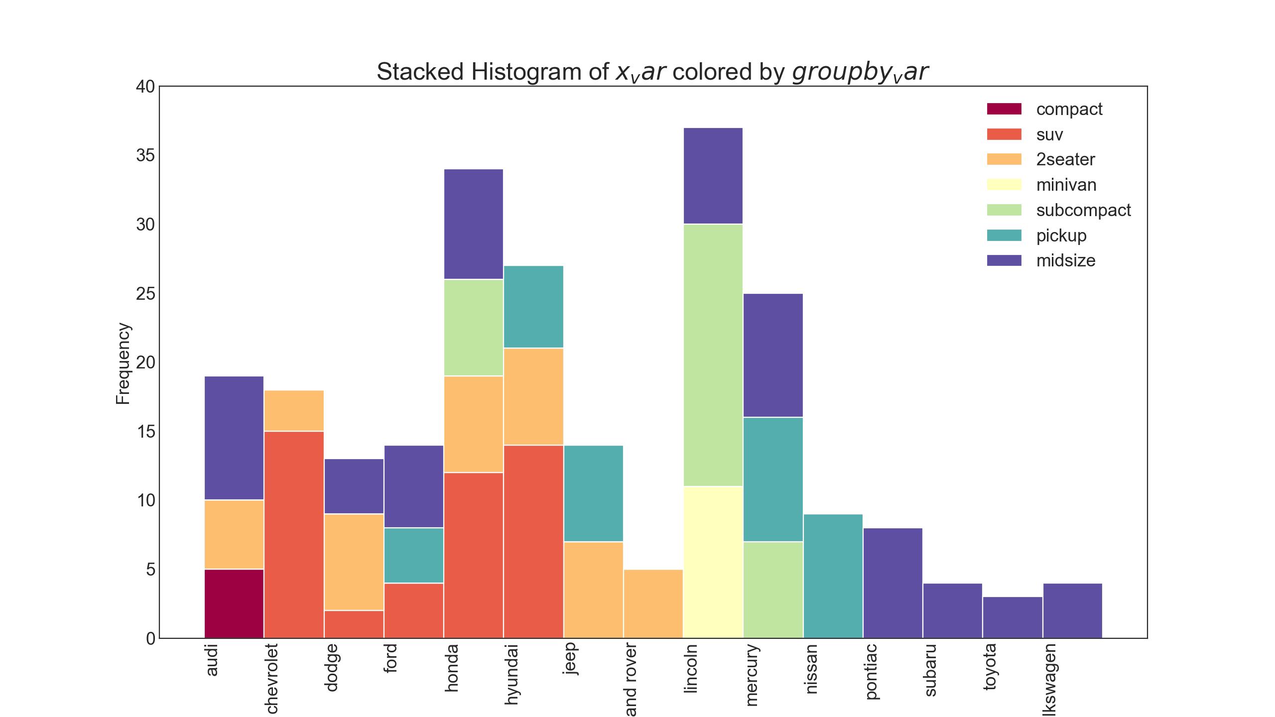 分类变量的直方图显示该变量的频率分布。通过对条形图进行着色,您可以将分布与表示颜色的另一个分类变量相关联。