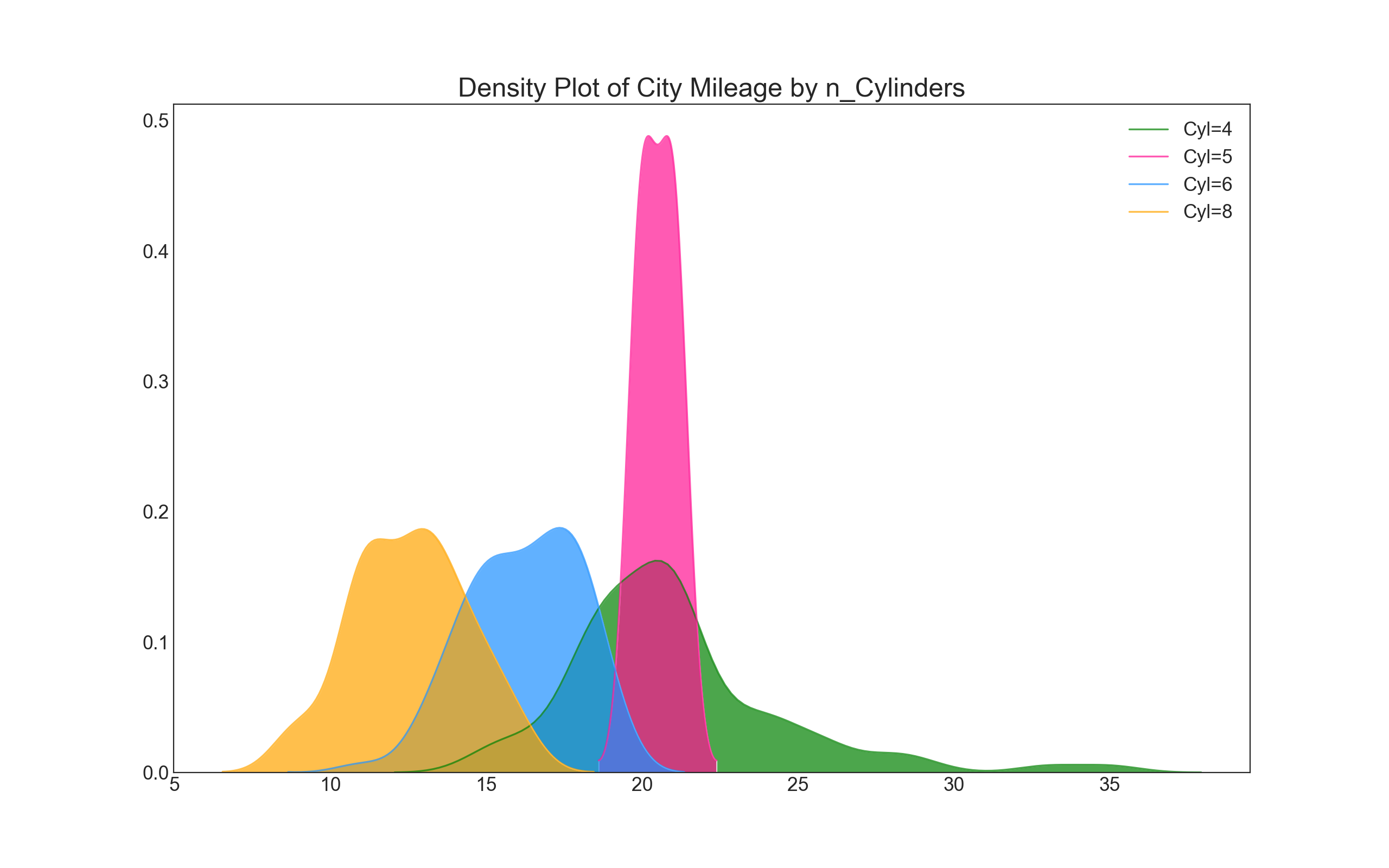 密度图是一种常用工具,可视化连续变量的分布。通过“响应”变量对它们进行分组,您可以检查X和Y之间的关系。以下情况,如果出于代表性目的来描述城市里程的分布如何随着汽缸数的变化而变化。