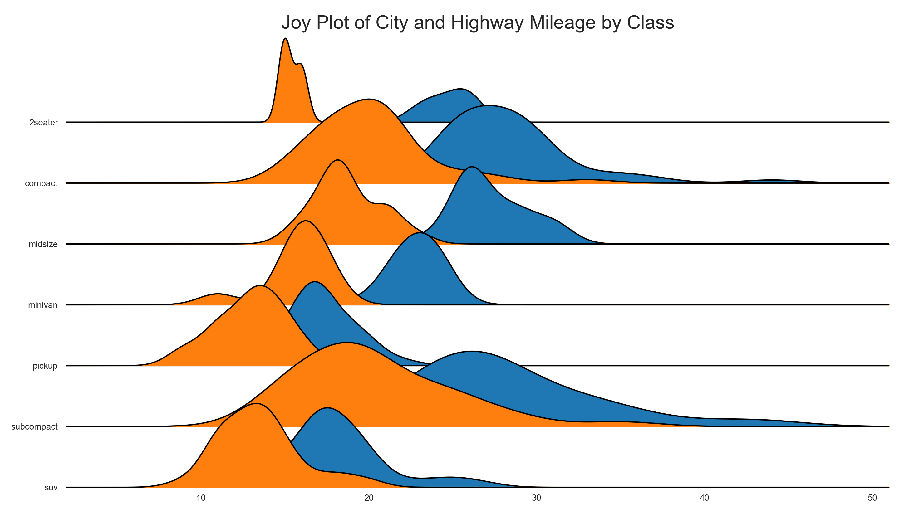 Joy Plot允许不同组的密度曲线重叠,这是一种可视化相对于彼此的大量组的分布的好方法。它看起来很悦目,并清楚地传达了正确的信息。它可以使用joypy基于的包来轻松构建matplotlib。