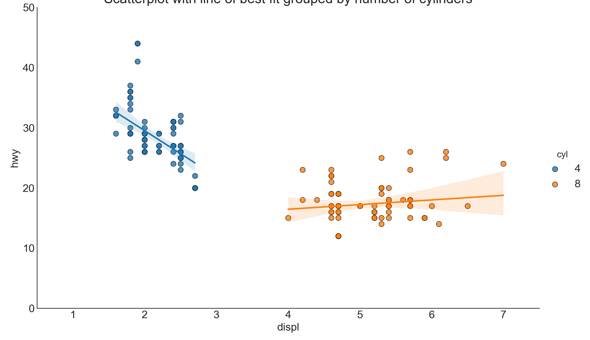 如果你想了解两个变量如何相互改变,那么最合适的线就是要走的路。下图显示了数据中各组之间最佳拟合线的差异。要禁用分组并仅为整个数据集绘制一条最佳拟合线,请从下面的调用中删除该参数。
