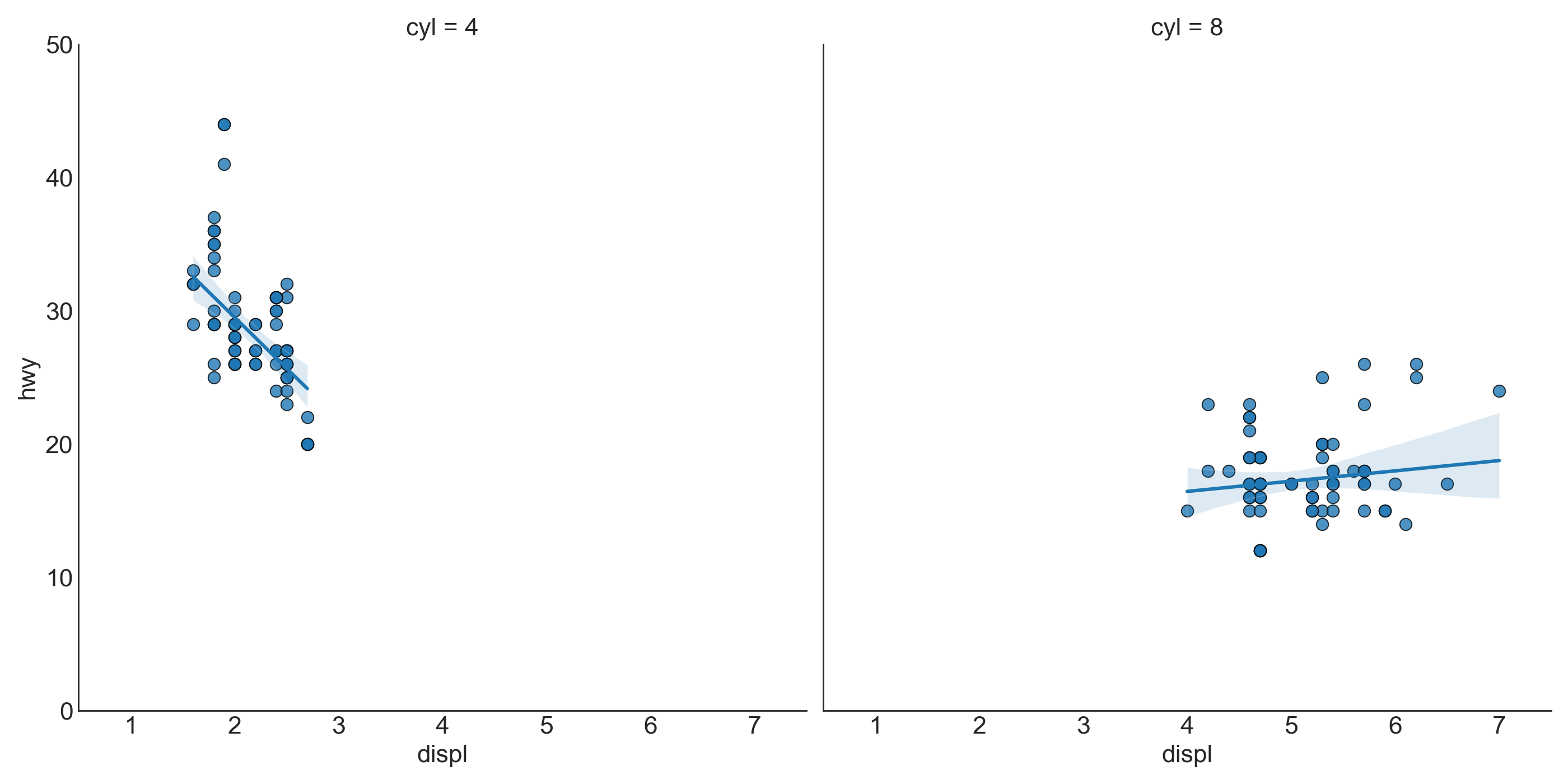 或者,您可以在其自己的列中显示每个组的最佳拟合线。你可以通过在里面设置参数来实现这一点。