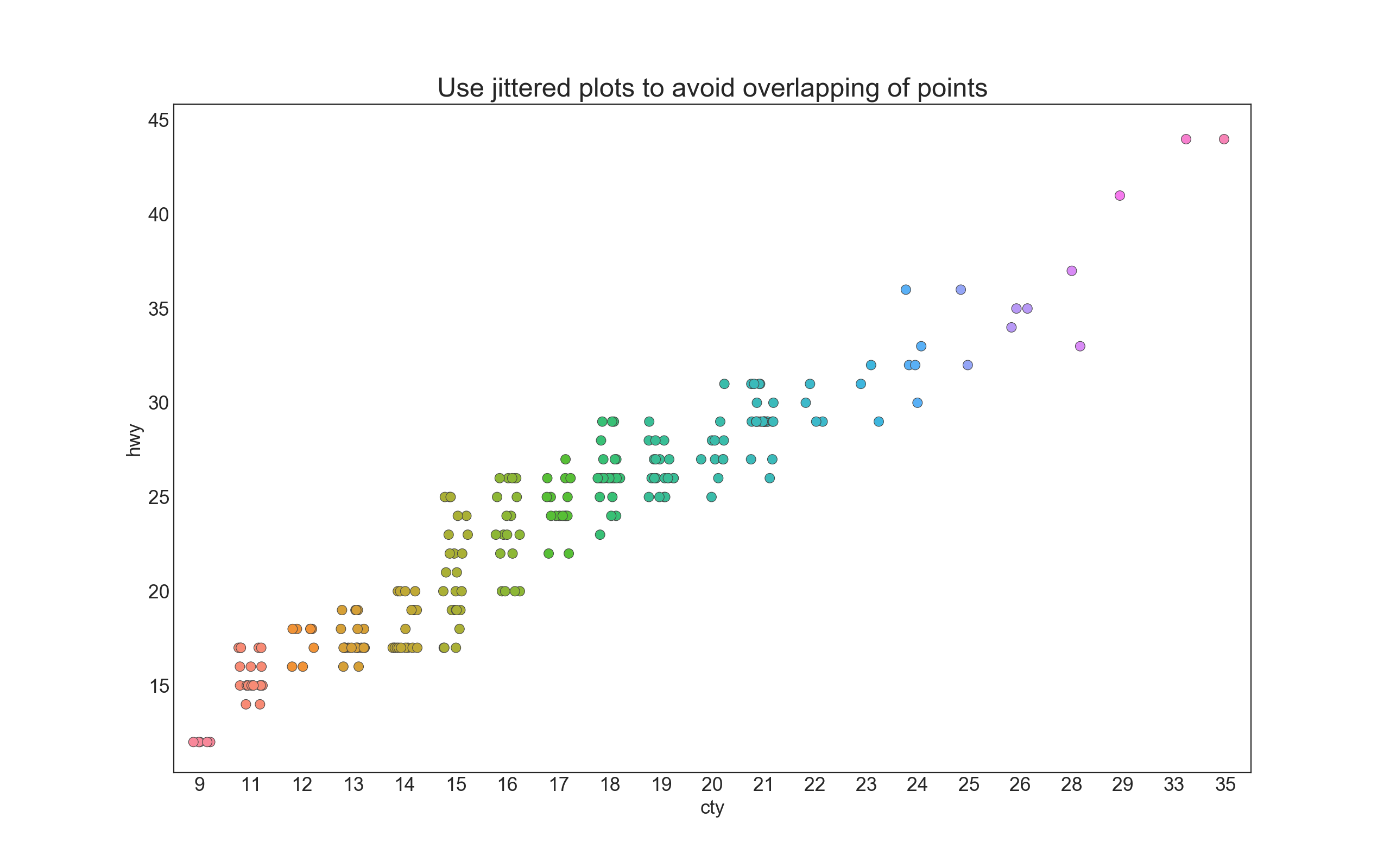 通常,多个数据点具有完全相同的X和Y值。结果,多个点相互绘制并隐藏。为避免这种情况,请稍微抖动点,以便您可以直观地看到它们。这很方便使用