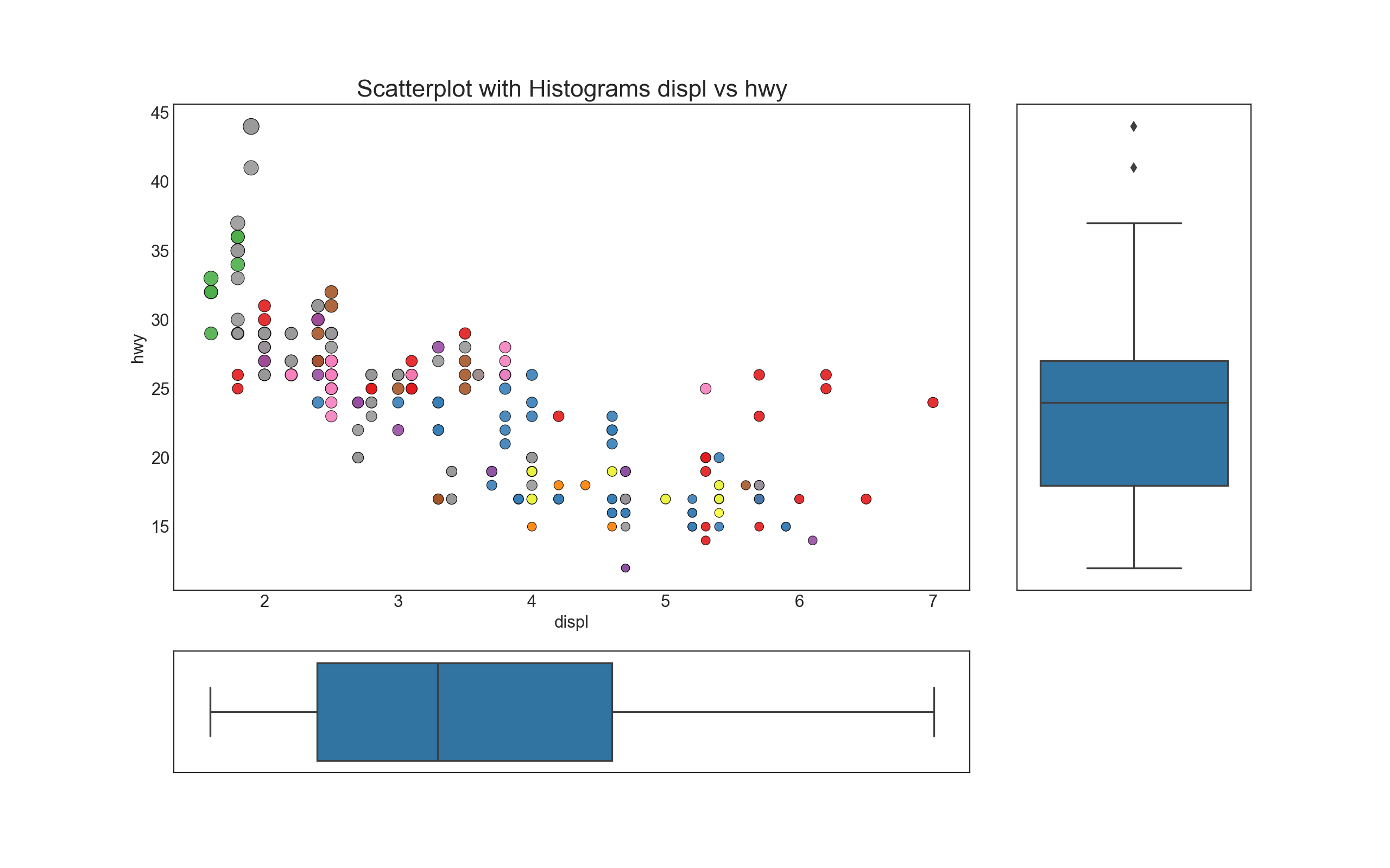 边缘箱图与边缘直方图具有相似的用途。然而,箱线图有助于精确定位X和Y的中位数,第25和第75百分位数。