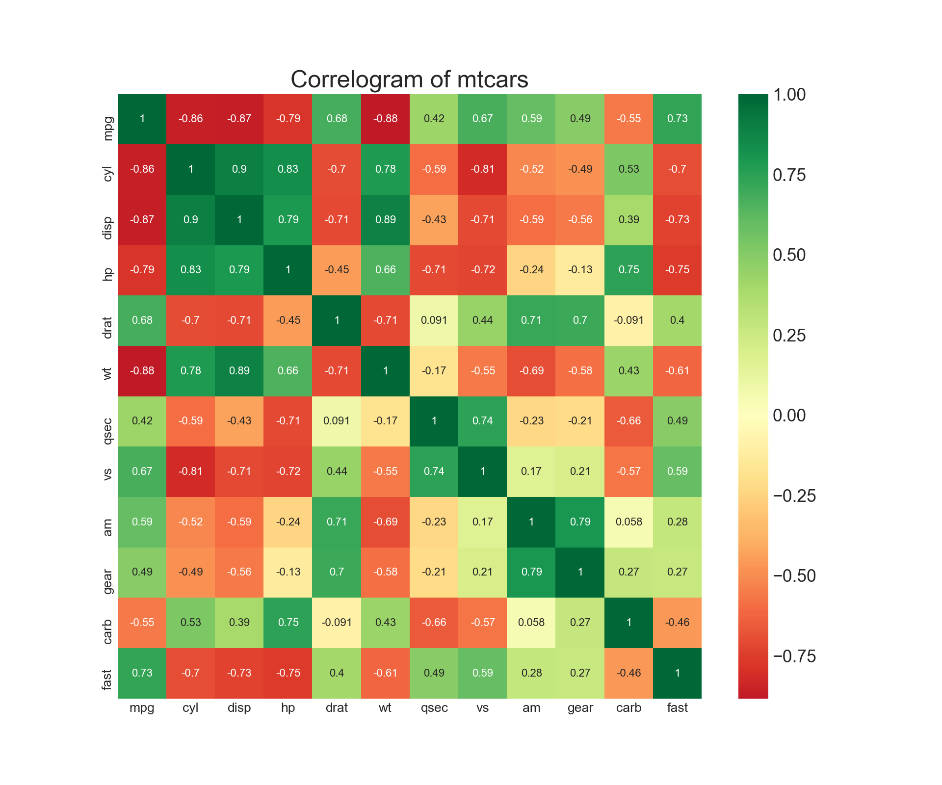 Correlogram用于直观地查看给定数据帧(或2D数组)中所有可能的数值变量对之间的相关度量。